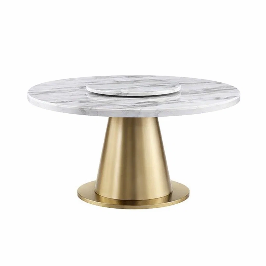 La table est composée d'un plateau en marbre de Carrare et d'une base en métal doré de haute qualité. Le diamètre du plateau est de 120 cm, et la hauteur totale de la table est de 75 cm. La table pèse environ 30 kg. Pour l'entretien, nettoyez avec un chiffon doux et humide.